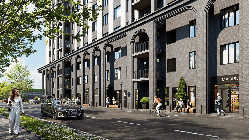 Первое, что впечатляет: фасад здания с удивительными арочными сводами, вдохновленный шедеврами мировой архитектуры. В вечернее время он красиво подсвечивается, отсутствует визуальный шум в виде кондиционеров – они спрятаны в специальные корзины. Мультифункциональные стекла создают эффект отражения и позволяют сохранить комфортный микроклимат в помещениях.