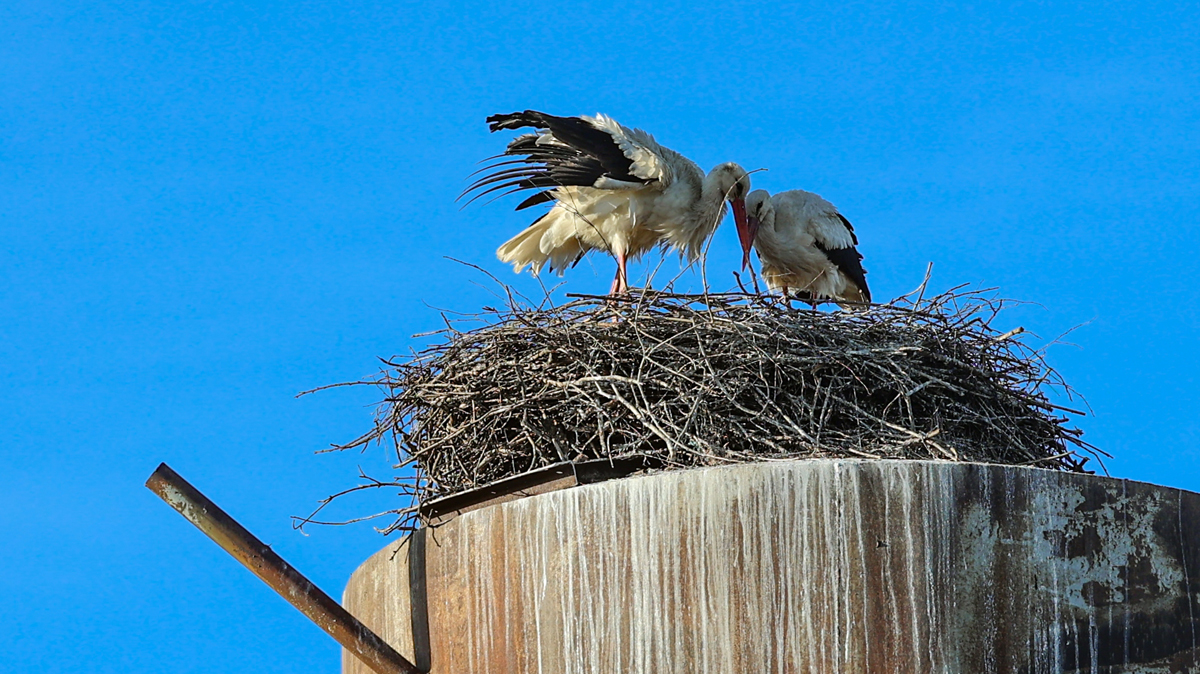 Отметим, аисты моногамны, и пара перелетных птиц ежегодно возвращается к тому же гнезду — вырастить потомство. Белые аисты часто выбирают места обитания рядом с человеком, обустраивая свои гнезда на крышах домов и столбах, нередко обустраиваются именно на вершинах водонапорных башен. После спаривания самка откладывает от 3 до 5 яиц. Птенцы вылупляются не одновременно, первенец обычно крупнее всех остальных. Аисты демонстрируют высокий уровень родительской заботы: оба родителя участвуют в строительстве гнезда, высиживании яиц и выкармливании птенцов.