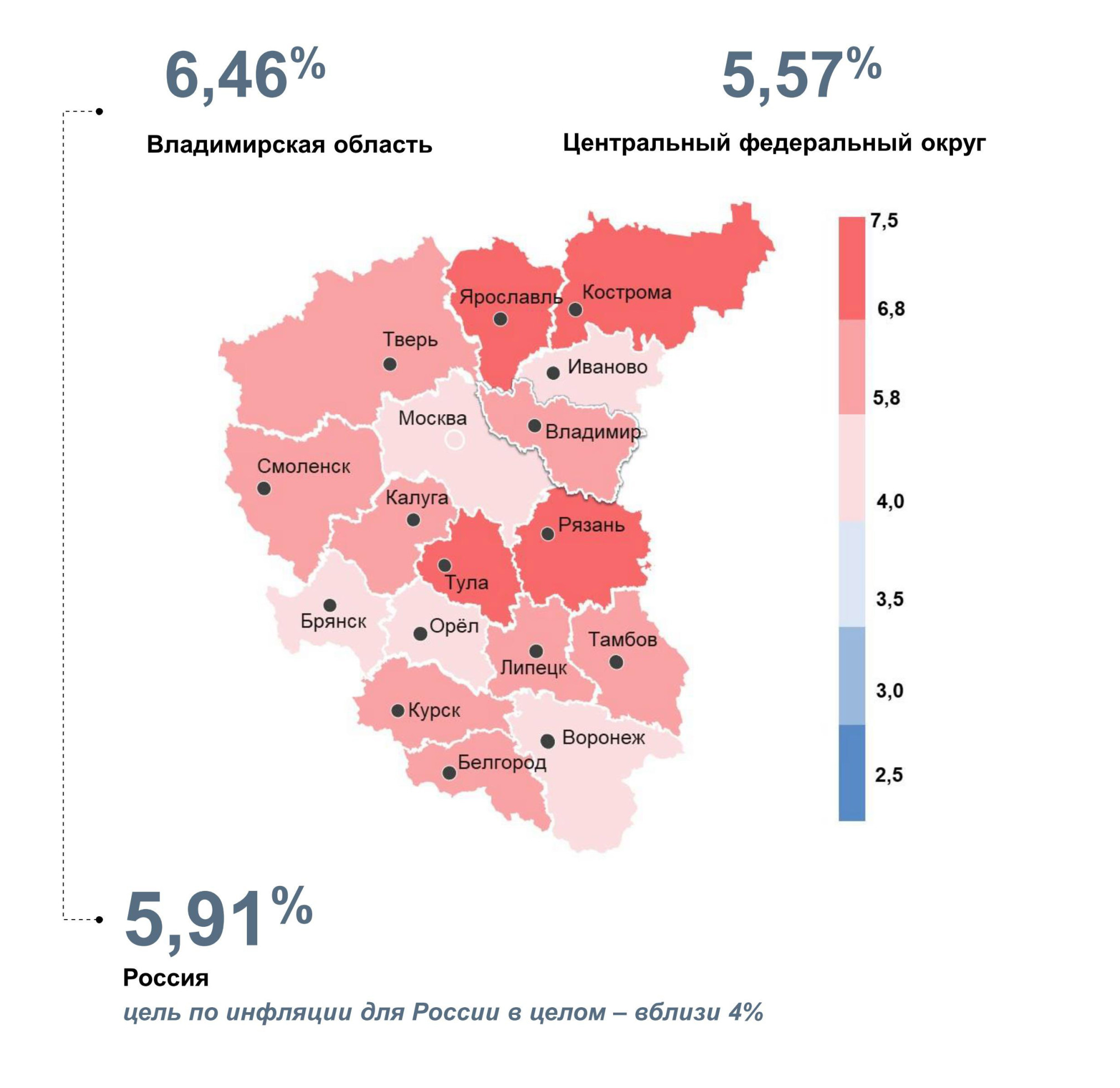 Годовая инфляция во Владимирской области замедлилась, но сложилась выше, чем в целом по стране. За 12 месяцев в регионе больше, чем в России, подорожали услуги и продовольственные товары. Заметно больше выросли цены на жилищные и коммунальные услуги (включая аренду квартир), медицинские услуги, а также на чай, кофе, какао и рыбопродукты.