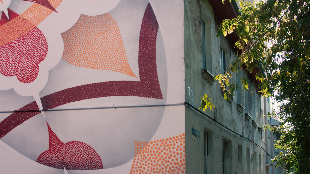 Заросшие отмостки, разбитые фундаменты и стены, от которых пластами отваливается штукатурка — привычная картина для четырех двухэтажных домов улице Алябьева. Здесь параллельно можно восхищаться изящным оммажем Юрия Вольфа и Яны Антоновой на «Купание красного коня» Петрова-Водкина, восторгаться величественной геометрией «Древа жизни» Кирилла Ведерникова, и — только за угол свернуть — изучать особенности кирпичной кладки образца второй половины 1950-х.