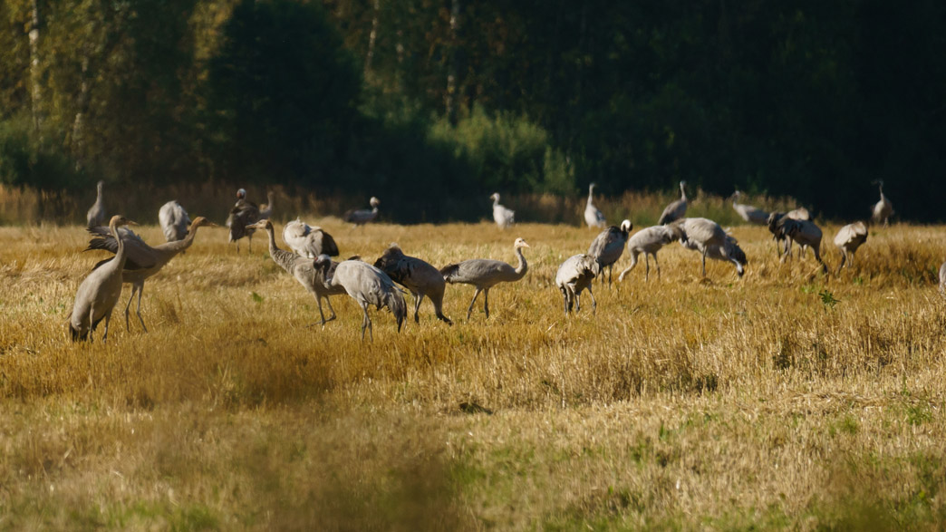 «В период осеннего перелёта к местам зимовки, серому журавлю свойственно образовывать миграционные скопления, которые выполняют важное приспособительное значение, в первую очередь по защите от хищников…