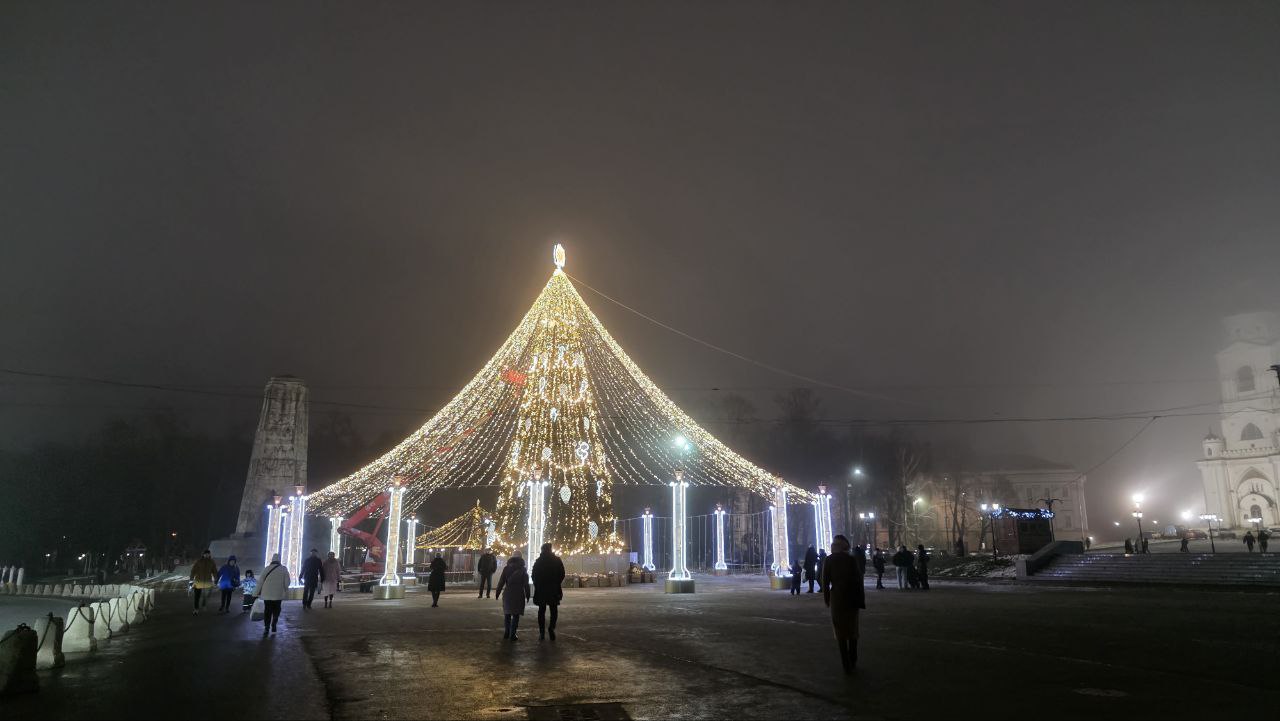 Жителям города Владимира подбавили новогоднего настроения - монтаж главной ели на Соборной площади близится к завершению. На данный момент рабочие развешивают последние 2D-игрушки, шары и монтируют последний сектор светового шатра из гирлянд, который крепится к стилизованным фонарям, переливающимся огоньками. Проверяют монтажники и работу звукового оборудования. Стоит признать, что в таком сверкающем виде и с горящими игрушками ель выглядит более привлекательно, нежели при дневном освещении и без положенной подсветки. Правда, туманная и влажная погода пока не дарит полноценного ощущения грядущего праздника.