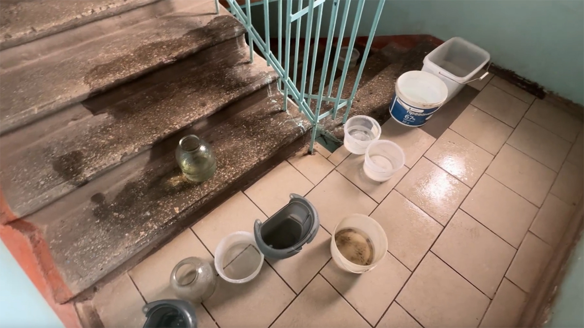 Удручающая ситуация сложилась в доме №90 по Большой Московской — это дом с аркой, расположенный в самом верху Богословского переулка, ведущего к Вокзальному спуску. Там из-за протечки в одной из квартир рухнула часть потолка, из-за влаги отклеились обои, а для борьбы с протечкой приходится ставить по несколько тазиков и ведер.