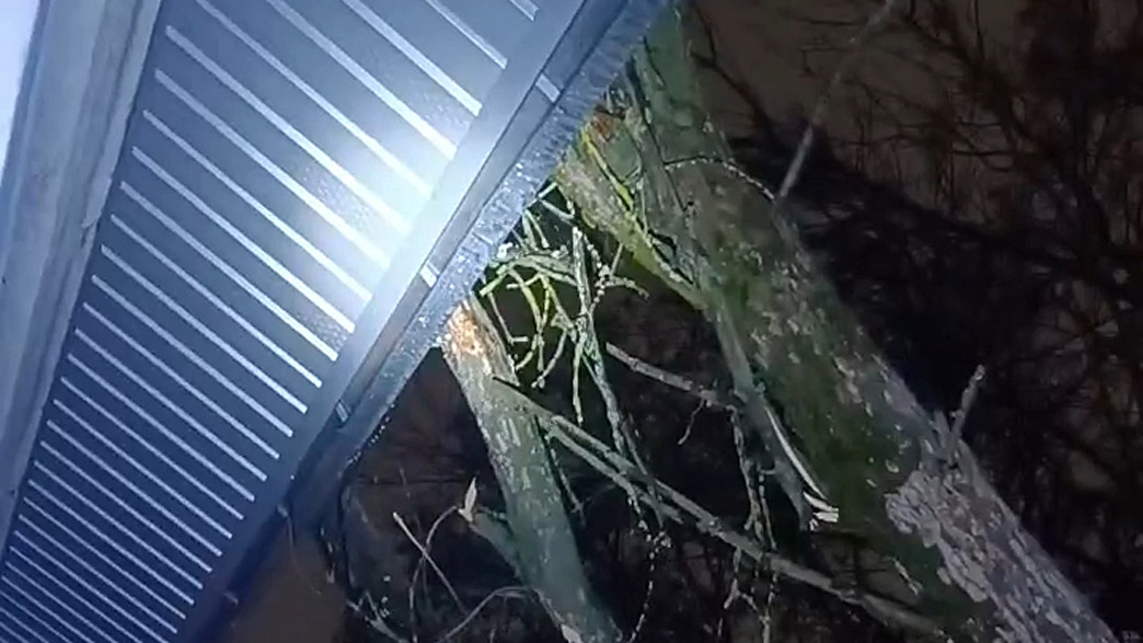 Житель дома №14 на улице Каманина рассказал и показал, как ночью, когда во Владимире был порывистый ветер, на трехэтажный дом со школьного участка упало высокое сухое дерево, достав до верхних козырьков и крыши.