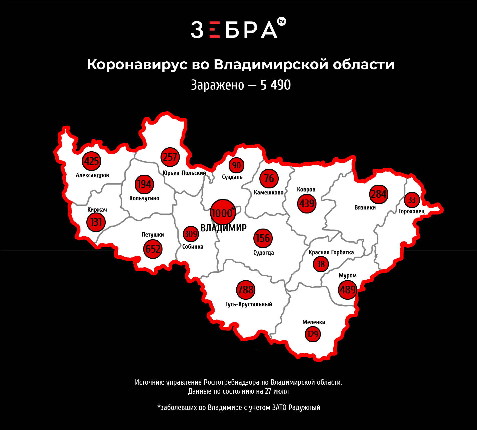 К утру 27 июля, по данным регионального управления Роспотребнадзора, количество заболевших за все время эпидемии коронавируса во Владимирской области достигло 5 490: