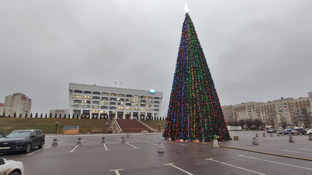 Перед зданием правительства Владимирской области на Октябрьском проспекте города Владимира, как и в прошлом году, установили «пизанскую» новогоднюю елку. По фото хорошо заметно, что верхняя часть искусственного дерева накренилась в сторону Белого дома, будто кланяясь областным чиновникам.